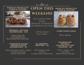 Beasley’s Farm & Loaves is a small family-run farm stand and micro-bakery located in Cadiz, Kentucky. We offer handcrafted sourdough bread, homemade baked goods, and farm-fresh eggs — all made in small batches with simple ingredients and traditional methods.